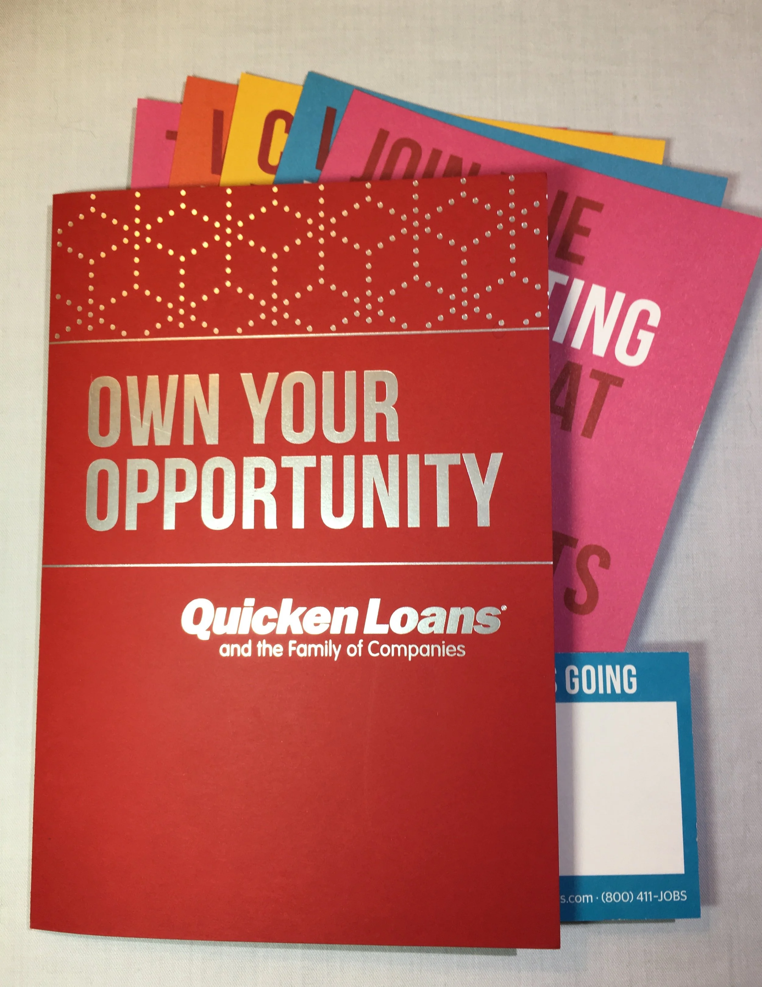 The Quicken Loans Campus Ambassadors visit nearly 50 career fairs each year, and needed eye-catching materials to distribute to potential candidates. We created small folders and a modular flyer system that allowed candidates to select the career areas that appealed to them. We also created stand up banners, tables, interactive displays, and social posts.